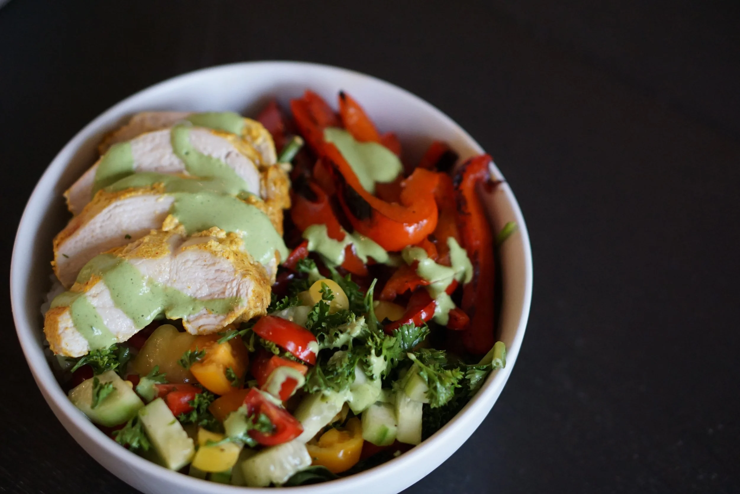 This recipe is here to prove to you that chicken does not have to be boring. Yogurt-marinated chicken breasts, tossed with Middle Eastern spices and baked to perfection — served over quinoa with a fresh tomato cucumber salad and a drizzle of sauce (my green goddess sauce shown here). Mmmmm!