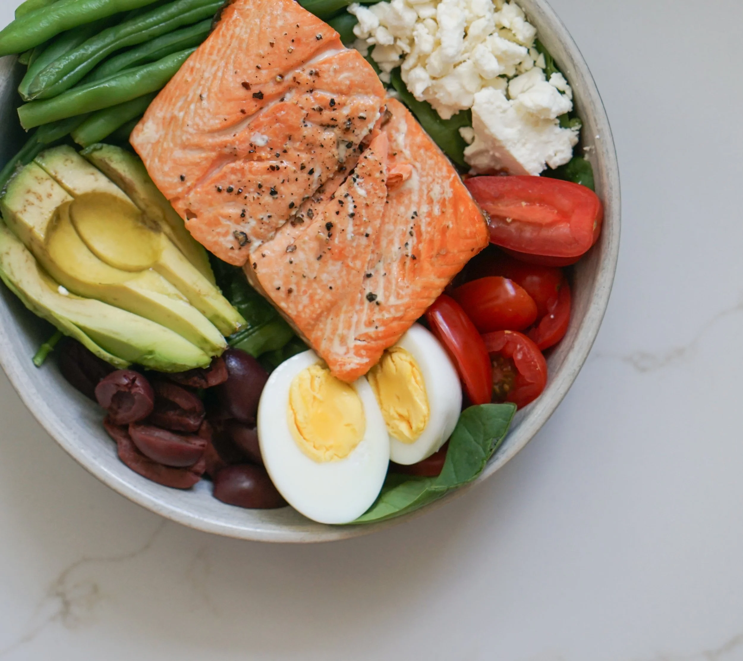 In a salad bowl, add the spinach, cherry tomatoes, olives, green beans and egg. Top with the salmon and drizzle with the lemon dressing.