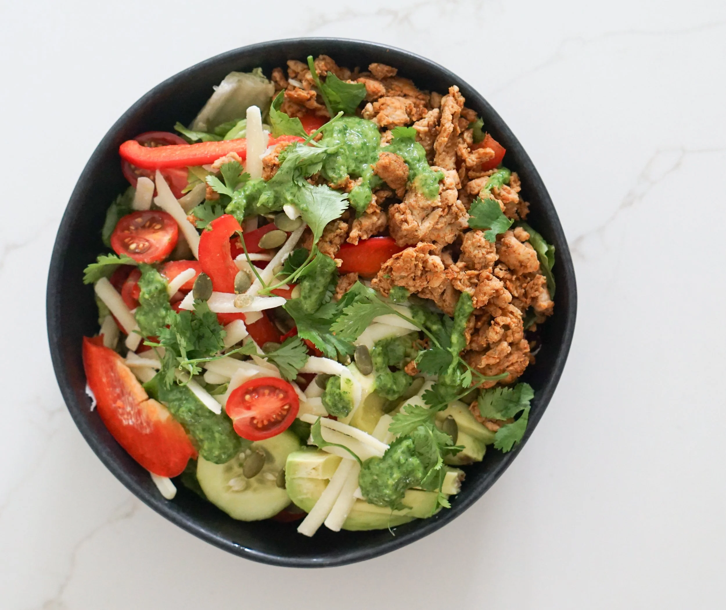 To make the meat crumbles, heat a pan with avocado oil to medium-high. Mix the turkey with the taco seasoning and then add to the pan. Break the meat up into small pieces, stirring the meat as you do. Cover and cook until done.